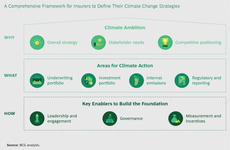 - Competitive Positioning. Each insurer should start by benchmarking its current climate strategy against that of its peers, both in terms of recent performance and commitments made. This will help the company understand what actions are viewed as table stakes and, in turn, what is required to be a leader.