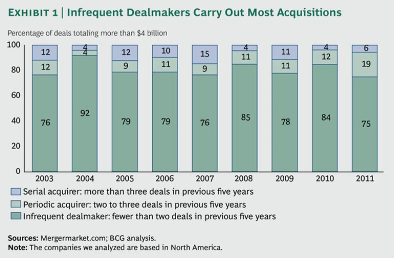 For the vast majority of companies, acquisitions are infrequent events. (See Exhibit 1.) Most companies respond by reallocating resources and building or hiring temporary capability to handle integrations on an ad hoc basis.