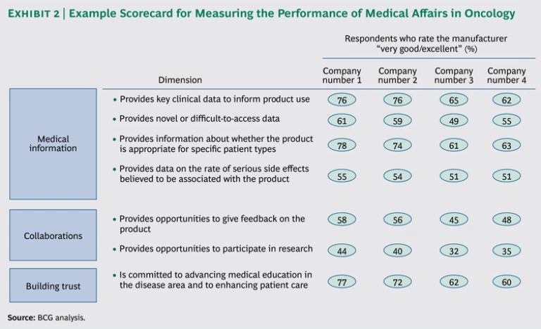 Keep a scorecard. The last step is to track the organization’s progress in meeting the information needs of medical professionals. In medical affairs, the most effective way to measure success is through direct feedback from physicians. This can be compiled through a concise survey that focuses on the aspects of medical information that are most critical to physicians and includes comparisons with competitors. We have helped clients design and field surveys to establish a baseline metrics scorecard. (See Exhibit 2.) This survey can be readministered on a regular basis and used to inform refinements to the medical-information strategy over time.