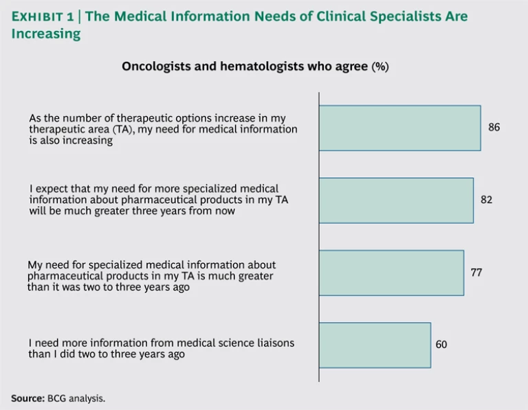 - How much help do medical professionals need to distill and interpret the medical information that is most relevant? The number and complexity of available products—the level of “noise” in the information landscape—drives the answer to this question. For example, our research indicates that oncologists, like many other specialists, seek extensive information on the products they use. Most oncologists, focused on a broad range of cancers with many possible treatment options, are inundated with data and visits from medical science liaisons (MSLs)—representatives from pharma-company field medical teams—on a regular basis. Oncologists are more likely than other specialists to demand that MSLs be adept at sifting through the available data to produce a set of customized information that is especially relevant for them and their patients.