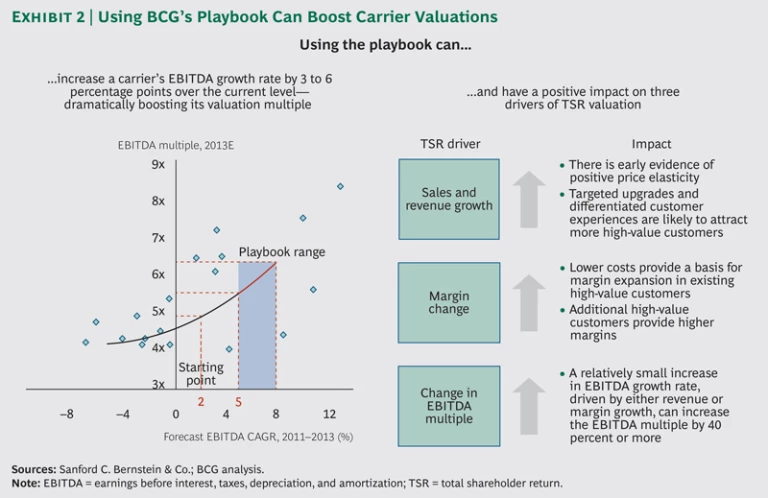The result can be a dramatic rise in enterprise value. BCG estimates that an aggressive deployment of a least-cost network targeted to high-value customers can realize a three-year growth rate of earnings before interest, taxes, depreciation, and amortization (EBITDA) that is at least 3 to 6 percentage points higher than current levels. While the lower end of this range would come simply from reduced costs, additional achievement will depend on how successfully the carrier is expanding its high-value customer segment and even capturing additional revenue from it. These are eye-opening figures, since even a relatively small rise in EBITDA growth will increase a company’s valuation significantly. Indeed, a carrier with a preplaybook EBITDA compound annual growth rate of 2 percent, which is typical for many carriers today, should see a postplaybook rate of 5 to 8 percent. A jump to 8 percent would translate to a 40 percent increase in the company’s valuation multiple. (See Exhibit 2.)