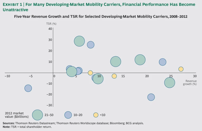 An old adage is ringing true for developing-market mobility carriers (DMMCs): all good things must come to an end. What seemed like boundless growth just a few years ago has turned out to have limits after all—and some rather unforgiving ones at that. Mobile penetration has reached saturation levels in most countries. Average revenue per user is deteriorating. And competition, having turned from fierce to brutal, now includes free alternatives to mature voice and messaging services through companies such as Facebook and WhatsApp.