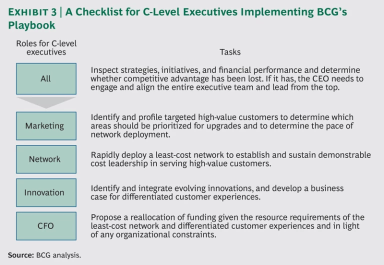 The chief innovation officer—perhaps a new addition to the carrier’s organization chart—will be tasked with identifying and integrating innovations. This will include developing the business case for new services and partnerships and defining the benefits that customers will receive. Finally, the chief financial officer (CFO) will need to reallocate funding so that both prongs of the upgrade strategy—the network and the differentiated customer experience—have the necessary resources, including head count. The CFO will also take on an overall monitoring and evaluating role, ensuring that all parts of the plan stay on track. (See Exhibit 3.)