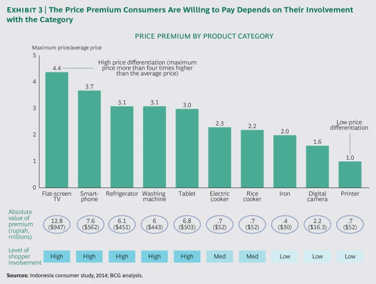 Our survey showed that this involvement depends on the perceived benefits that a product provides compared with other products, and the product’s impact on the consumer’s social image. Critically for manufacturers, the degree of involvement correlates with the price premium that consumers are willing to pay. (See Exhibit 3.)