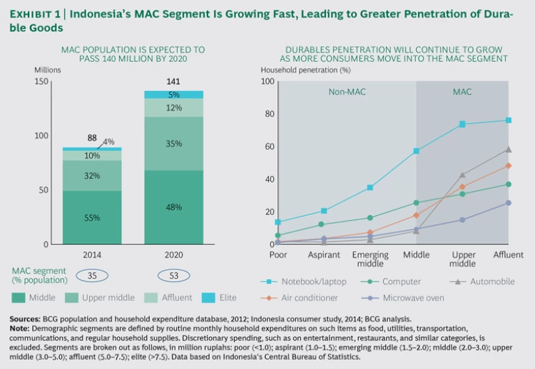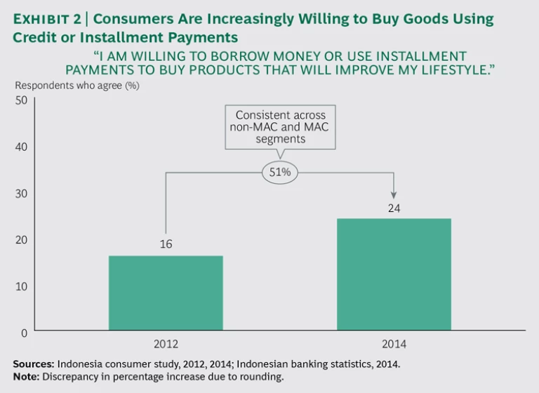 Third, durable goods are increasingly seen as an important consumer need, far more so than in the past. Accordingly, Indonesians are more willing to borrow money to finance the purchase of such products. In 2014, 50% more consumers than in 2012 were willing to finance a durable product with credit, and this growth was consistent across MAC and non-MAC segments. (See Exhibit 2.)