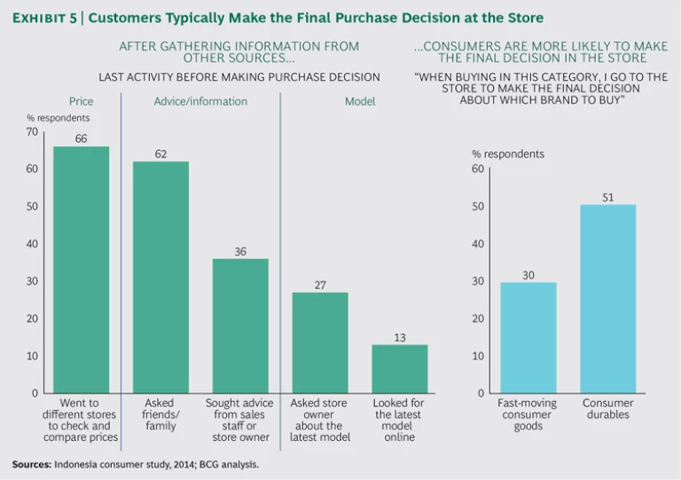 5. The retail store is increasingly important for influencing brand choice in durables. Stores are the second-biggest source of awareness of durable products (after free-to-air TV), and they play a large role in influencing consumers. Across all categories, roughly 50% of final purchasing decisions are made in the store. (See Exhibit 5.) Store owners and employees are the key influencers and sources of information at the point of purchase. Many shoppers also prefer to evaluate products in person before making a purchase, and this preference holds especially true for durable goods.