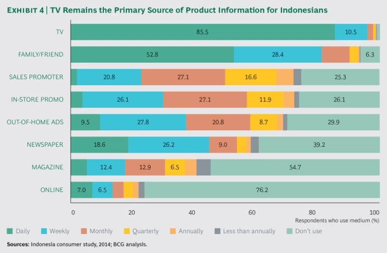 4. Television remains the primary source of product information, but digital is growing fast. Nearly 90% of Indonesia’s population watches TV daily, especially in rural areas. (See Exhibit 4.) By contrast, exposure to digital is limited, but it is growing rapidly and will play an increasingly important role in the future, particularly as the country’s Internet infrastructure improves. The ways in which digital technology has affected other emerging markets give an indication of its likely effects in Indonesia. Initially, consumers begin comparing product features and prices online and start reading and writing reviews of the brand. Later, as the logistics of home delivery get worked out and consumers become more comfortable buying online, e-commerce rises dramatically. (Notably, digital is more effective at engaging the core consumer group of 25- to 35-year-olds.)