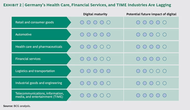 As expected, the seven industries did not score equally. (See Exhibit 1.) Germany’s automotive sector and logistics and transportation industry are already well positioned from a digital perspective, although they will need to work to maintain that edge. But health care and pharmaceuticals, financial services, and the telecommunications, information, media, and entertainment (TIME) industry lag well behind global best practices and will require significant effort just to catch up. (See Exhibit 2.)