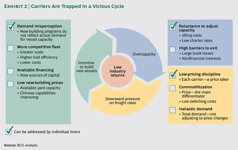 - Carriers. Many midsize carriers have negative operating margins as a result of low and volatile freight rates and poor operational performance. The industry is entrapped in a vicious cycle: to survive downward pressure that overcapacity has imposed on prices, carriers seek to lower slot costs by acquiring new, larger, and more efficient vessels. The net influx spawns further overcapacity and lowers vessel utilization, putting even more downward pressure on prices. Many forces are driving this cycle, and individual liners can address only a few of them. (See Exhibit 2.)