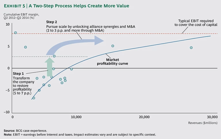 To lift their profitability, global carriers will need to adopt a two-step approach. (See Exhibit 5.) First, they will have to transform themselves internally by making the following moves: