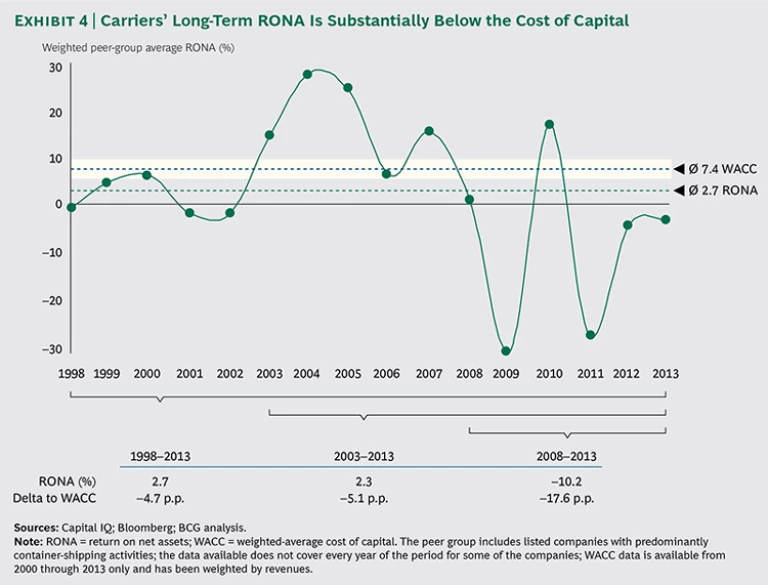 In covering their estimated cost of capital, most carriers face an uphill battle. (See Exhibit 4.) Indeed, over the past 15 years, their return on net assets (RONA) has been only about 3 percent. This is well below the 9 percent RONA of the S&P 500 for the same period, and it falls far short of covering the roughly 7 percent cost of capital needed to finance the assets deployed. Hence, not only have these carriers returned substantially less than companies in other industries, they have also destroyed significant value over a lengthy period.