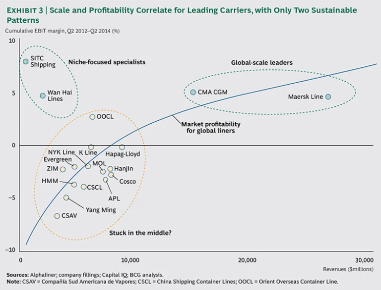The two carrier types that have fared best are global deep-sea-scale leaders and niche-focused specialists. (See Exhibit 3.) The rest—midsize carriers—remain stuck in the middle, trapped between those two extremes.