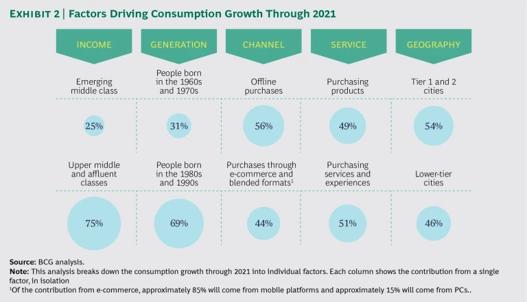 Three factors are the primary drivers of future consumer growth: China’s emerging upper-middle-class and affluent households, the spending habits of the younger generation, and the increasing role of omnichannel e-commerce. (See Exhibit 2.)