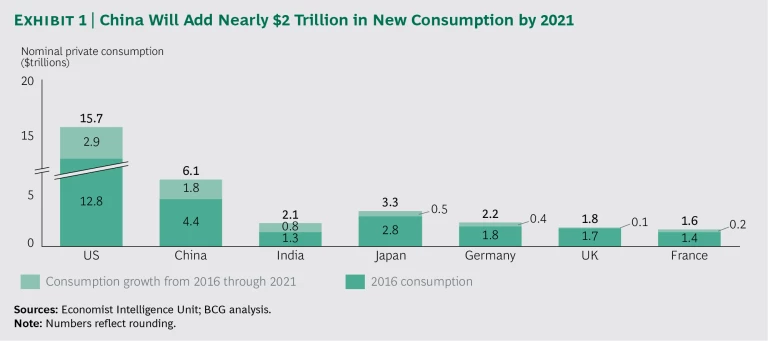 China’s overall economic growth is slowing, but the Chinese consumer economy is still massive in absolute terms and poised for increasing growth. The country will see nearly $2 trillion in new consumption by 2021—about 27% of the total consumption growth that will occur in major economies during that time. China thus represents one of the biggest opportunities for consumer companies in the world for the foreseeable future.