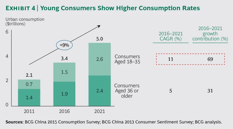 As in developed countries, the younger generation in China (people aged 18 to 35) shows a greater appetite for consumer goods. In 2016, this group made 1.5 trillion dollars’ worth of purchases (up from $700 billion in 2011), and projections call for a continued sharp rise in their spending, to $2.6 trillion in 2021, reflecting a compound annual growth rate of 11%, compared with a CAGR of just 5% for purchases made by consumers aged 36 or older. (See Exhibit 4.) At that point, aggregate consumption by the younger generation will exceed that of older age groups in China.