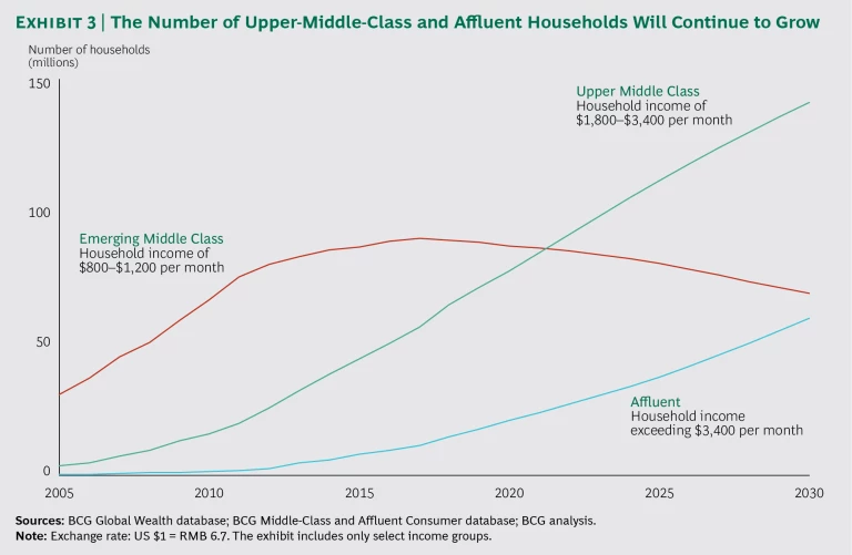 Income levels in China are rising, so the population of upper-middle-class and affluent families is rising as well. (See Exhibit 3.) These households have more accumulated wealth, and that leads to increased spending in discretionary categories such as furniture and home decoration, travel, and entertainment.