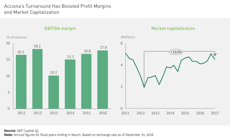 Acciona was hit with the kind of market disruption that can put a company out of business. However, by aggressively reducing its debt, cutting costs, tapping into new sources of financing, realigning its portfolio to higher-growth markets, and investing in innovation, Acciona’s management team has created a bright and sustainable future for the company.