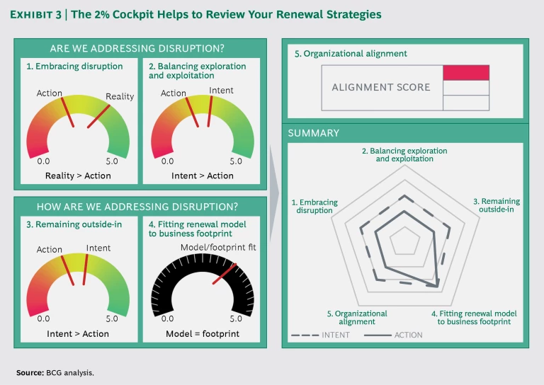 5. Review your renewal strategies explicitly. Pursuing excellence on all four of the previously described traits can be exhausting for an organization. As a result, explicitly reviewing your company’s performance is necessary to ensure that all dimensions are tackled and that there are no gaps between intention and action. To this end, we have built a simple, pragmatic assessment tool that helps executives to rapidly weigh their strategies against the four traits. We call it the “2% cockpit” because it helps to show executives how to pilot their organizations the way that 2% companies do. Exhibit 3 is a sample cockpit view.