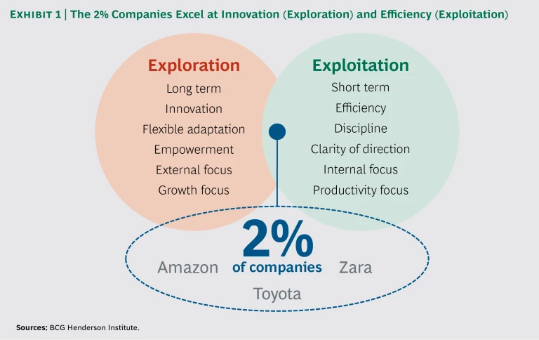 - First and foremost, these companies are excellent at both exploration and exploitation. They continually rethink and revise their strategies and operating models while improving their current products and operations.