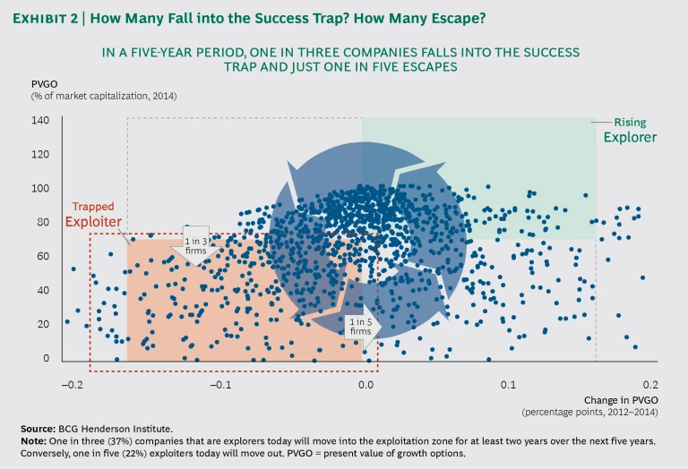 The success trap, conversely, is associated with too much exploitation. That is the case when a company is satisfied by the returns on exploiting present knowledge and technologies. Its current success will tempt the company to continue exploiting, at the expense of exploration—although exploration is necessary in the long term. We found that fully one-third of companies fall into the success trap during a five-year period and that only one in five manages to escape. These companies are pictured in the lower-left quadrant of Exhibit 2.