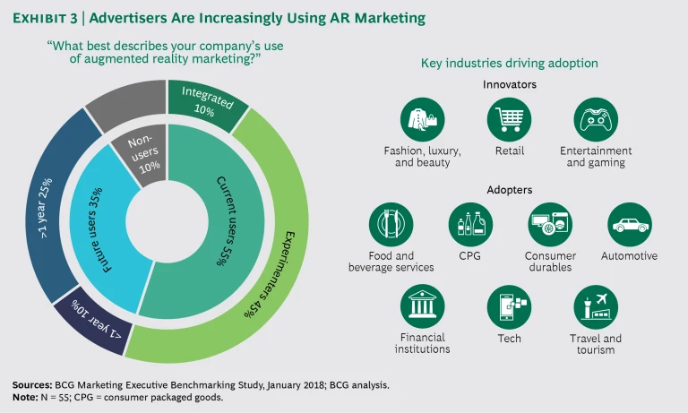 Given the fast-rising adoption of AR by users and the increasing interest by advertisers, Snap commissioned BCG to undertake a study of AR’s impact on the consumer-advertising market. As part of this BCG Marketing Executive Benchmarking Study, we surveyed more than 50 CMOs and senior marketing executives from the top 200 advertisers in the US, spanning multiple industries, on their current usage of AR and their outlook for future usage. We interviewed a sample of these executives directly to provide further details and insights.