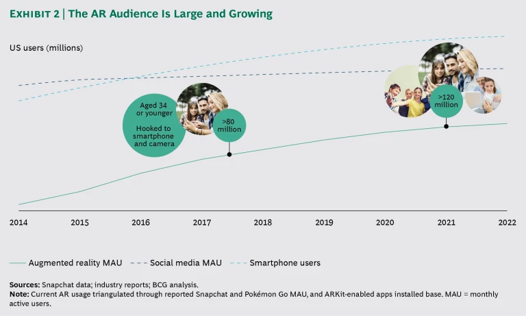 The AR opportunity is already bigger than many marketers realize. On the basis of 2017 data from Snapchat, Pokémon Go, and other AR applications, we estimate that more than 80 million people in the US, or roughly one-third of all smartphone users, engage with AR at least monthly. (See Exhibit 2.) The consumers using AR applications are a particularly attractive segment for advertisers: most are millennials (aged 19 to 34) or Generation Z consumers (aged 18 or younger). They use their smartphones and cameras continually throughout the day, communicating via images and video as much as they do through text and voice. This behavior opens up an entirely new method for engaging with consumers—an interactive approach where the advertiser is a participant in the “conversation” or activity rather than a company delivering a message.