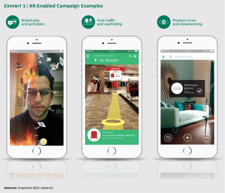 By blending the physical and digital worlds and enabling users to actively shape their experiences, AR offers unique ways for marketers to interact with consumers. These can range from brand overlays, to navigation and wayfinding, to virtual showrooming. (See Exhibit 1.) Our survey of over 50 of the top 200 advertisers in the US shows that marketers recognize the opportunities in AR. More than four out of five respondents said that AR marketing is a differentiated way to engage with customers. “There is high potential in AR to help transform the way we market,” a senior retail marketer told us. “The current traditional forms of digital marketing someday will be looked at as old school.”