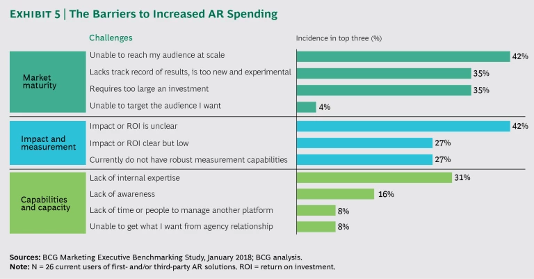 Despite the size of the opportunity and the encouraging results from early movers, big advertisers report several challenges that are preventing them from scaling up their AR efforts. Specifically, companies are wrestling with obstacles related to market maturity, impact and measurement, and internal capabilities and capacity. (See Exhibit 5.) In some cases, these barriers appear to be rooted in a lack of knowledge or understanding, so we expect they will recede over time. Advertisers may need to make a concerted effort to overcome others, however.