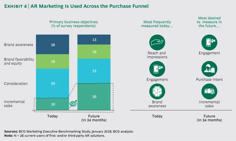 Advertisers regard AR as a marketing tool that can help engage consumers along all stages of the marketing funnel, from awareness to purchase. Currently, most are focused on the top and middle stages (awareness and consideration), but they expect more bottom-of-funnel activity to develop. In our research, fewer than one in five advertisers considers “incremental sales” a primary objective for AR marketing today, but more than a third expect it to be a primary objective 24 months from now. This prioritization of bottom-of-funnel objectives is also reflected in the metrics that advertisers use in AR campaigns. Today, advertisers look to AR to boost reach, engagement, and awareness, but the metrics they most want to use AR for two years from now are engagement, purchase intent, and sales. (See Exhibit 4.)
