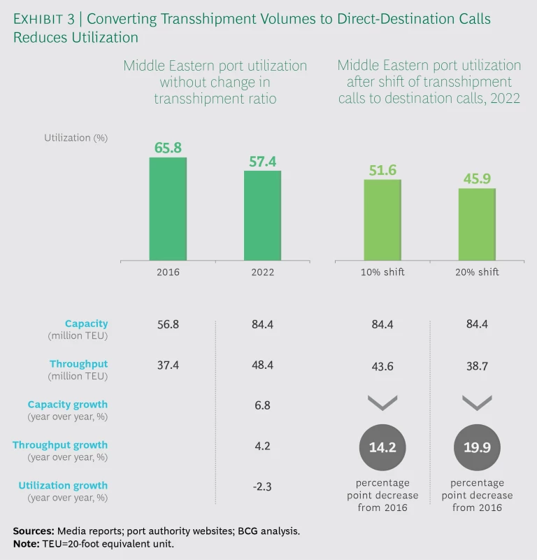 If smaller destination ports succeed in attracting large volumes of direct calls, the current model of serving the entire region with a few transshipment hubs will be threatened. Even at constant levels of trade, overall utilization will fall sharply. To calculate throughput, transshipped containers are counted multiple times (because they are loaded off of ocean carriers and then loaded onto smaller vessels for discharge at destination ports). Decreasing transshipment volume would eliminate many of these transfers. Considering the steps already taken by the region’s destination ports, we estimate that 10% to 20% of transshipment volumes could become direct-destination volumes by 2022. If such a shift occurred, the overall utilization of Middle Eastern ports would be approximately 14 to 20 percentage points lower than in 2016. (See Exhibit 3.)