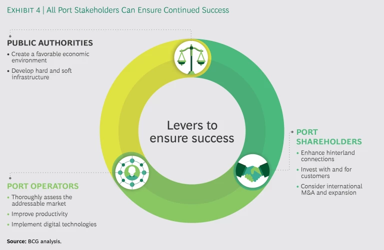 In the Middle East, the distinctions among these roles can be blurry. For example, public authorities are often shareholders of both ports and port operators. But the distinctions are still valuable when considering the types of moves that will maintain momentum. (See Exhibit 4.)