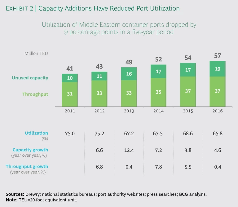 Rising Overcapacity. Middle Eastern ports have aggressively added capacity. From 2011 through 2016, container capacity increased by 16 million 20-foot equivalent units (TEU). This represented an annual growth rate of approximately 7%, versus 4% for container throughput. The additional capacity caused utilization at ports to fall by 9 percentage points, from 75% to 66%. (See Exhibit 2.) This utilization rate is generally considered low and puts downward pressure on handling rates. In some locations, the level of overcapacity is severe. Unless growth accelerates significantly, it does not appear that additional capacity will be required for the foreseeable future. Ultimately, the overcapacity will lead to a lower return on capital than is normally expected from port infrastructure investments.