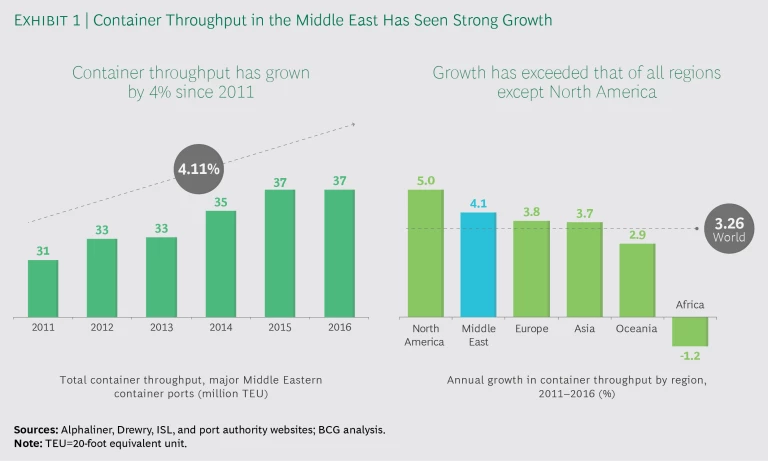 For many Middle Eastern ports, the region’s favorable economic climate since the global financial crisis has helped fuel good performance in terms of both volume served and financial returns. From 2011 through 2016, the compound annual growth rate of container throughput was 4%, which exceeded the global average. (See Exhibit 1.) The throughput growth rates of other types of seaborne cargo have also been impressive. But Middle Eastern ports face three looming threats to their continued success.