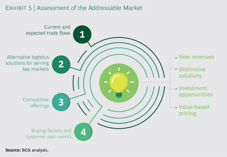 Thoroughly assess the addressable market. Port operators should seek to increase their share of wallet from the shippers they serve today, and they should target new business while avoiding head-to-head competition on handling rates. The best way to start is to conduct a thorough assessment of the end-to-end cargo flows served by the port, as well as the flows it could potentially serve in the future. (See Exhibit 5.) By gaining a deep understanding of the addressable market for additional business from their extended hinterland, operators can determine the winning strategy for their local context. This assessment is essential to developing a competitive, and possibly distinctive, value proposition for serving carriers and shippers.
