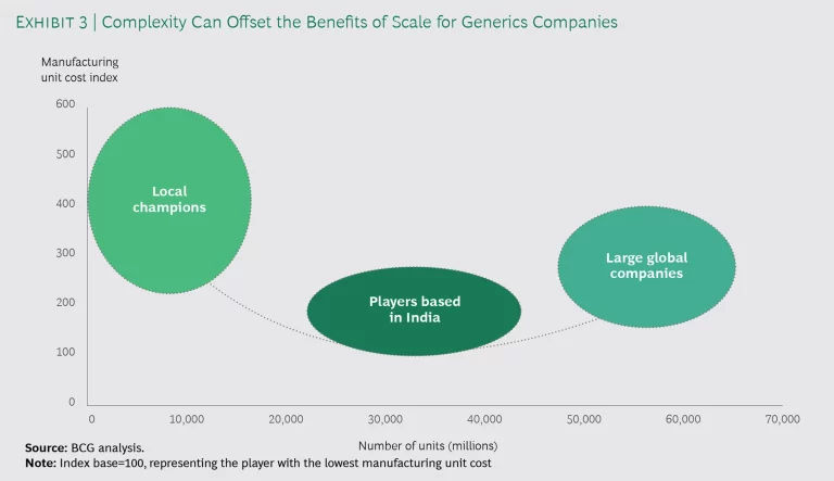 BCG’s 2019 Generics COGS Benchmark provides some valuable insights. The study, which included a range of global leading firms and local champions from the US, Europe, and Asia, found that the cost of goods sold as a percentage of revenue (COGS%) varies widely. Scale can help reduce small-molecule and biosimilar per-unit costs, but only to a point. Portfolio complexity has a huge impact, so companies need to monitor that complexity constantly.