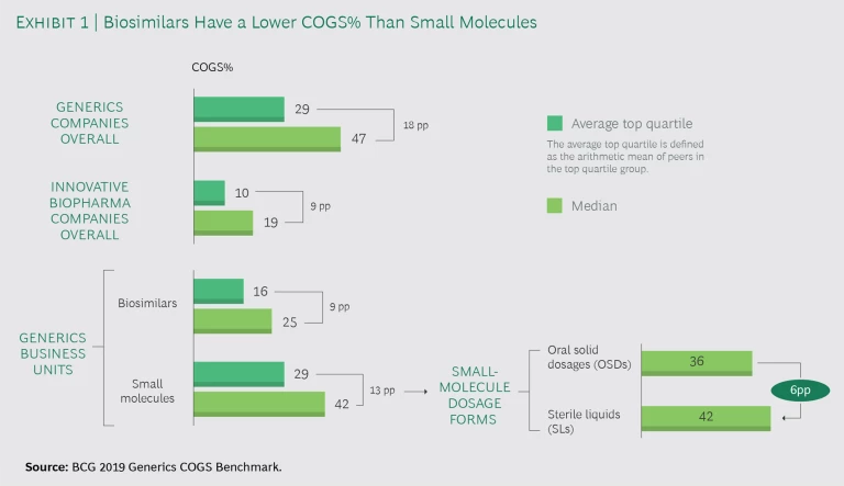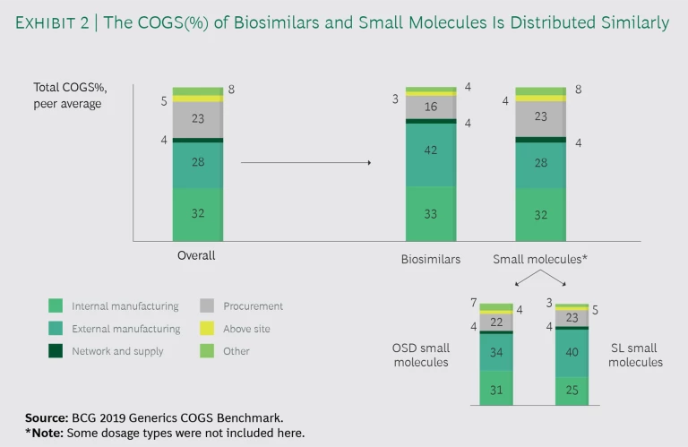Three key findings emerged: COGS as a percentage of revenues varies widely; firms that produce both generic small-molecule and biosimilar drugs spend the same portion of COGS on the same functions; and both scale and complexity affect COGS.