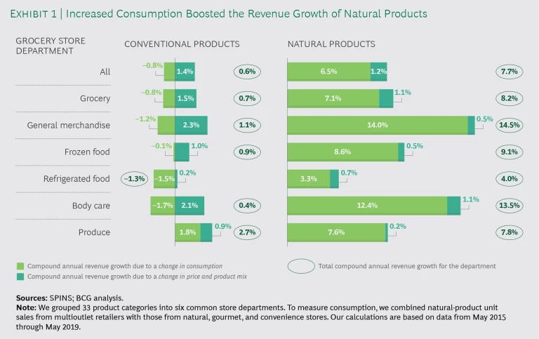 Significantly, this revenue growth has come mostly from an increase in unit sales, rather than a change in the price and product mix, a fact that suggests strong, sustainable growth. From mid-2015 through mid-2019, rising consumption (as measured by unit sales) boosted natural-product revenue growth by 6.5% per year, on average, while changes in the price and product mix added another 1.2% per year, on average, to revenue growth. That adds up to a 7.7% compound annual growth rate (CAGR) for the natural-products segment. (See Exhibit 1.) This performance stands in stark contrast to that of conventional CPG products, which managed to eke out an overall CAGR of 0.6% only because changes in the price and product mix boosted revenue by 1.4% per year, on average, mitigating an average annual 0.8% decline in revenue from unit sales.
