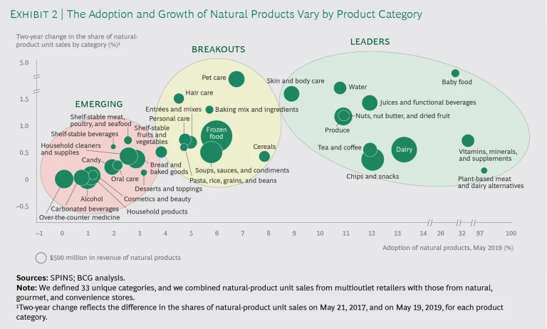 - Breakouts. Consumers are rapidly adopting the natural products in this group, and there is still plenty of room for growth, given that they accounted for only about 4% to 8% of their categories’ total unit sales. Breakouts will likely continue to scale quickly as consumers increasingly demand greater access to natural products.