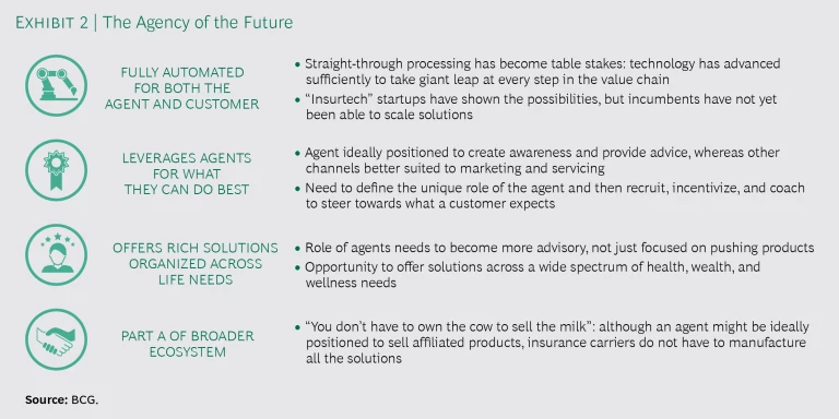 Although there is no one-size-fits-all formula for success, the agency of the future will likely be fully automated, will provide agents with qualified leads and other digital and analytic capabilities to boost their productivity, and will address customer needs more holistically, with richer solutions across their lifetimes. (See Exhibit 2.)