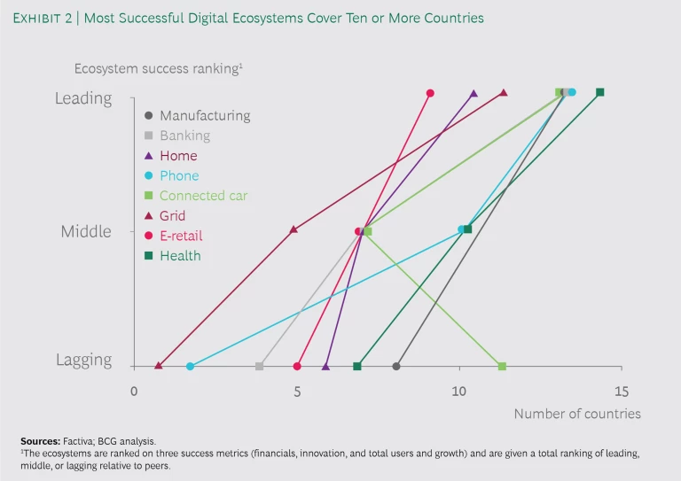 As with the total partner numbers, it seems that the wider the geographic reach, the better. (See Exhibit 2.) On average, successful digital ecosystems have partners in 10 or more countries, while typical ecosystems have just 5. For example, Ant Financial, which ranked highest among financial services peers, has core partners in 13 countries in the Americas, Europe, Asia, and Australia. These cross-border partnerships have been instrumental in satisfying Ant’s core Chinese consumers, who want to use payment apps while traveling abroad.