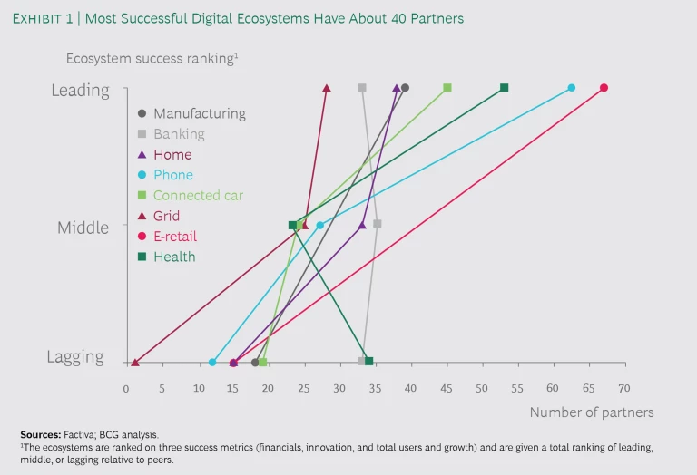 In fact, our analysis suggests that the more partners an ecosystem has, and the more industries they come from, the better that ecosystem will fare. While the average ecosystem has 27 partners, the most successful digital ecosystems have about 40. (See Exhibit 1.) Amazon, for example, has 67 core partners according to our analysis—roughly double that of its peers in e-retail—spanning logistics, finance, media, and telecommunications. Such a diverse group of partners inevitably leads to some misaligned expectations and some corporate-culture clashes. But orchestrators can’t just duck these challenges. Success clearly depends on the scalability and flexibility to bring in partners from a broad variety of industries.