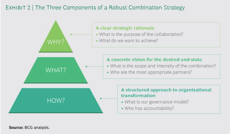 Next, develop a concrete vision for the desired organization end-state. Determine what form of combination—coordination, integration, or reconfiguration—makes the most sense given your strategic goals. Also, identify some intermediate steps along the way to the final end-state that will help the organization achieve the necessary buy-in or build the required capabilities. Finally, on the basis of your objectives and preferred approach, select the most appropriate governance model and the most likely partners.