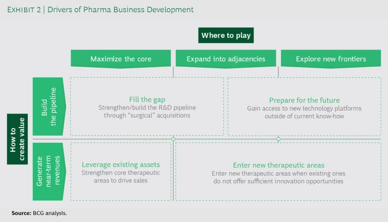 1. Prioritize what business development needs to accomplish for the company. Executive team members often have differing views about how to prioritize business units, technology areas, and technology platforms and what types of deals to pursue (early- versus late-stage R&D deals, for example, or transformative versus tuck-in acquisitions). To ensure alignment, it’s critical that team members agree on how and where they want to create value. Will they use business development to generate near-term revenues or to build the pipeline for future innovation? Will they seek to maximize the core, expand into adjacent markets, or explore new frontiers? (See Exhibit 2.)