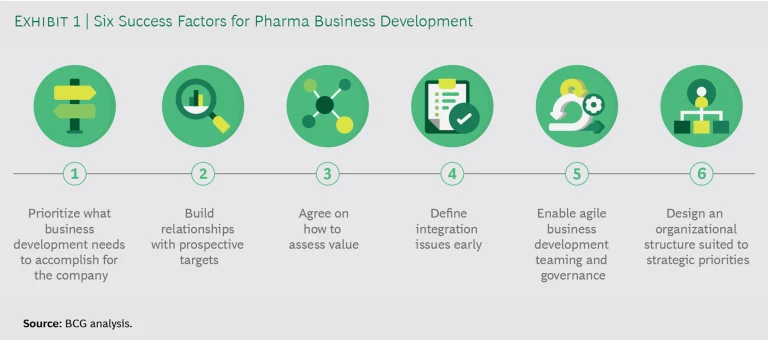 Six Success Factors for Pharma Business Development While we focus here on M&A, the six success factors we have identified will enable business development teams to create value through both M&A and licensing. (See Exhibit 1.)