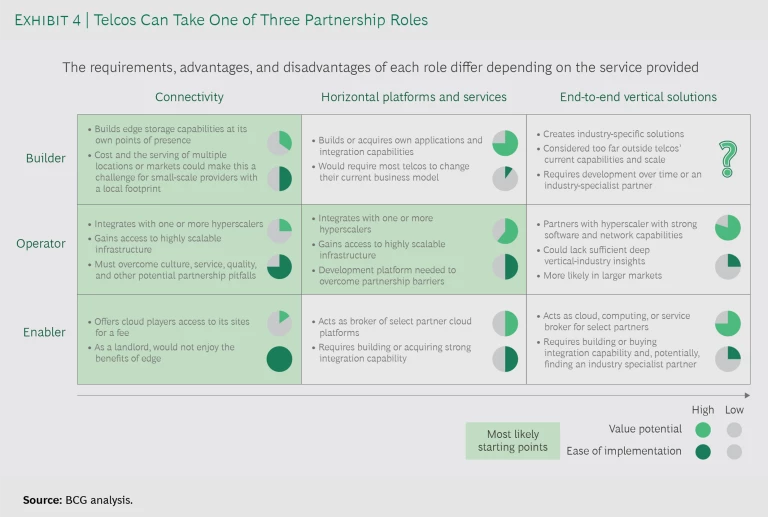 Telcos can assume one of three roles in an edge partnership. (See Exhibit 4.) They can act as a builder, constructing and running an edge-based service on their own or with limited participation from a partner. They can become an operator, running a service that a partner has created. They can become an enabler, acting as an integrator or creating a site, platform, or service that one or more partners use to provide their own services.