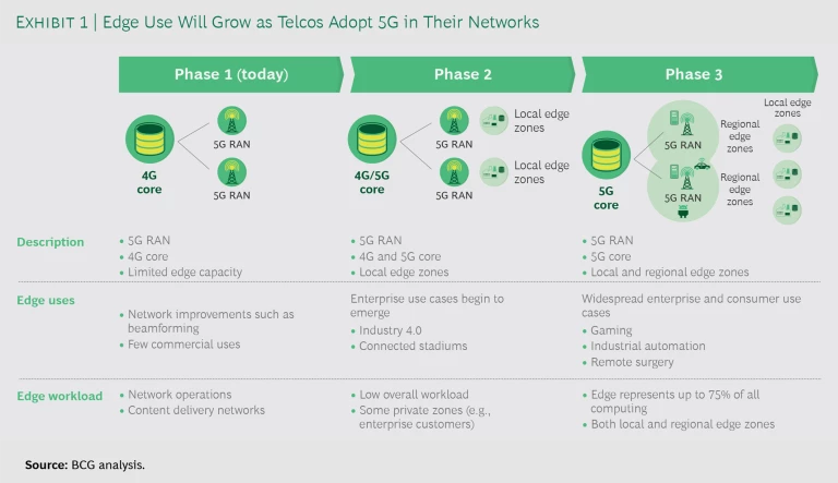 To free up physical space devoted to network and processing servers, telcos are upgrading to 5G RAN first, before moving to upgrade their core network architecture to 5G core as well. (See Exhibit 1.) That will enable edge computing and storage in regional edge zones, where processing happens within a last-mile wireless hub or operator point of presence. 5G will also support private or local edge zones, where processing takes place inside a building, home, car, or other environment.