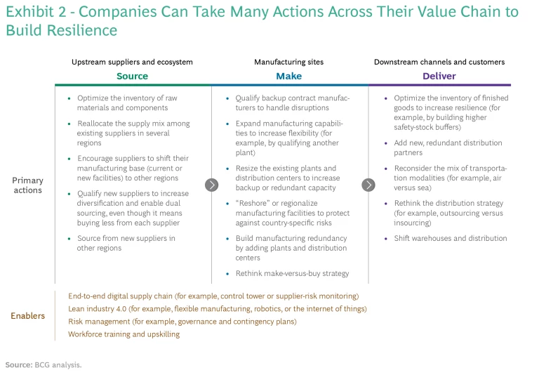 With this fact base in hand, companies can systematically reduce their exposure to the most significant disruption risks. Companies can take several risk-reduction actions along the source-make-deliver value chain, although some of these entail tradeoffs. (See Exhibit 2.) Examples of actions include the following: