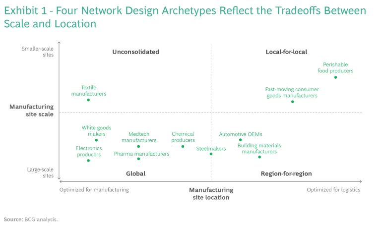 Over time, balancing the tradeoffs of scale versus location has resulted in four network design archetypes across production industries. (See Exhibit 1.)