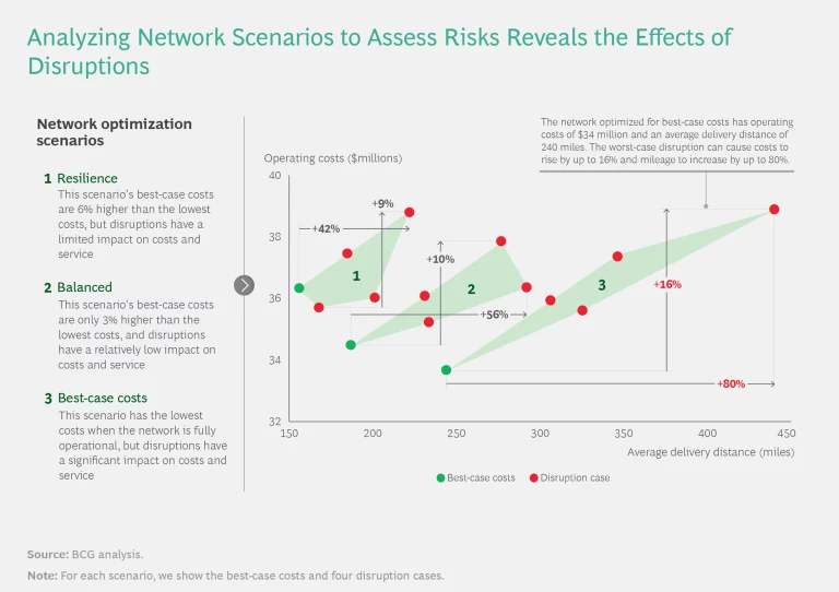 - The network optimized for resilience has best-case costs that are 6% higher than those of the network optimized for these costs. But the network is able to contain the impact of disruptions: costs increase by less than 10% and delivery mileage increases by 42%.