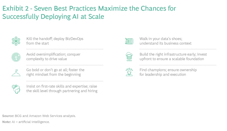 What is needed to realize the full benefit of AI in sales and marketing? A recent study by BCG GAMMA, the BCG Henderson Institute, and the MIT Sloan Management Review finds that the ability to engage in organizational learning with AI gives companies a 73% chance of reaping the financial benefits of their AI investments. But before companies can engage in learning with AI, they must scale AI applications, which is a major challenge for auto companies. A collaboration between BCG and Amazon Web Services (AWS) has identified seven best practices that maximize the chances of deploying AI solutions successfully across a global organization. (See Exhibit 2.)